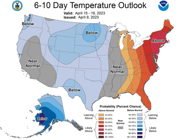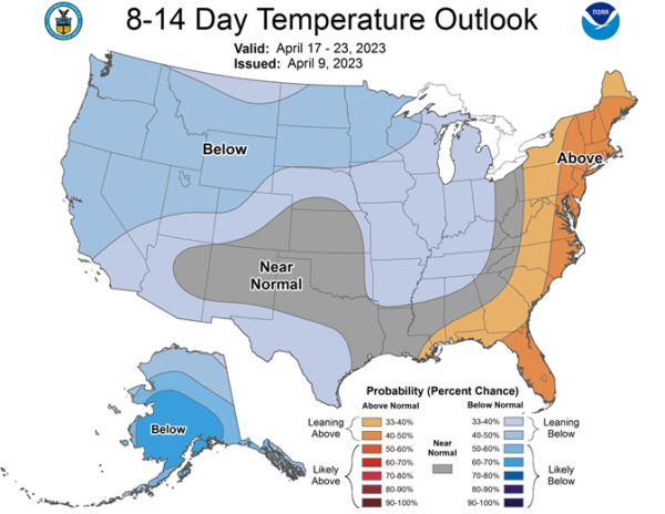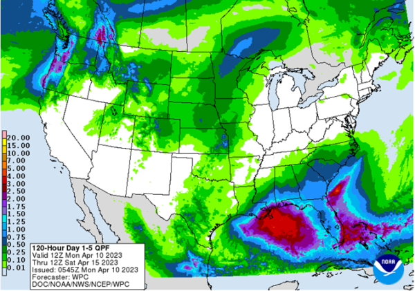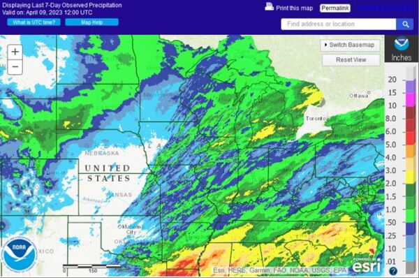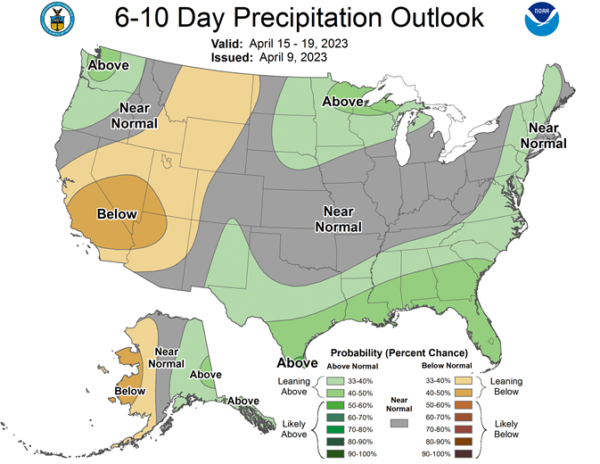 Delta Forecast: Another round of heavy rain moved through the region over the weekend. Showers will be unlikely for the front half of the week, but will increase with a system in the Gulf of Mexico for the end of the week and another front moves through over the weekend. Many areas are fairly wet, limiting fieldwork and planting. Precipitation is becoming less frequent, but still steady through the rest of April, which may cause some areas that are too wet, while others will find the proper conditions to get out into the field.