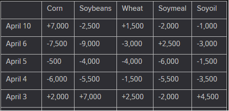 Preliminary changes in futures Open Interest as of April 10 were: SRW Wheat down 6,643 contracts, HRW Wheat down 1,176, Corn down 9,500, Soybeans down 8,110, Soymeal up 378, Soyoil down 5,331.