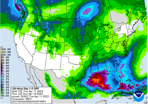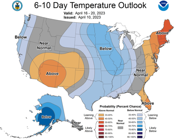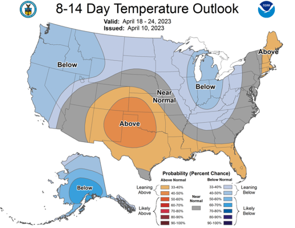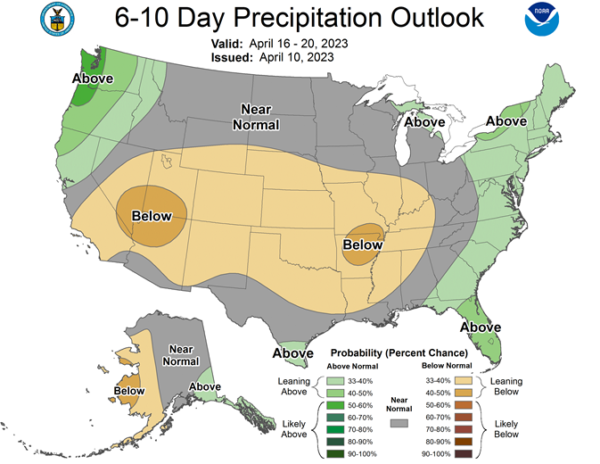 Central/Southern Plains Forecast: Mostly dry Tuesday-Wednesday. Isolated showers west Thursday. Isolated to scattered showers Friday. Temperatures above to well above normal through Thursday, near to below normal northwest and well above normal southeast Friday. Outlook: Isolated to scattered showers Saturday. Mostly dry Sunday-Wednesday. Temperatures below normal northwest and above normal southeast Saturday, near to below normal Sunday-Monday, near to above normal Tuesday-Wednesday.