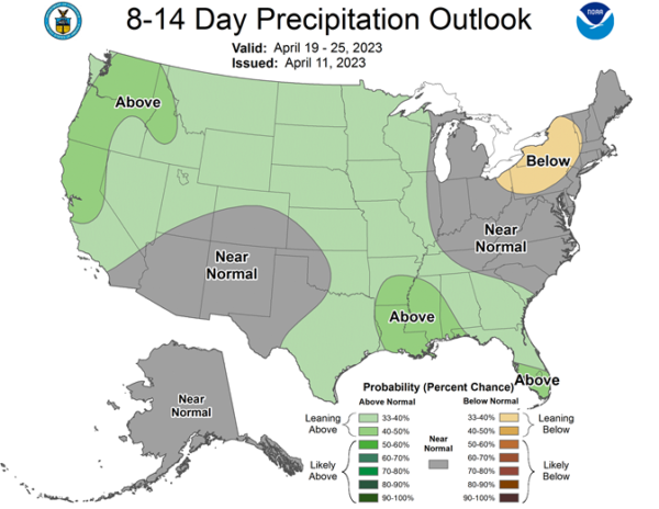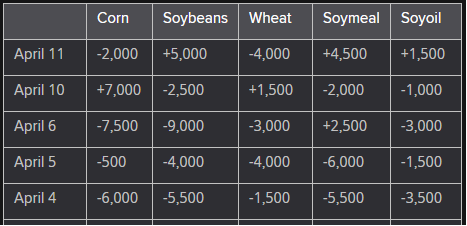 Preliminary changes in futures Open Interest as of April 11 were: SRW Wheat up 7,606 contracts, HRW Wheat down 1,524, Corn up 2,502, Soybeans down 162, Soymeal down 1,380, Soyoil up 1,299.