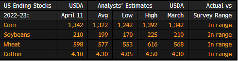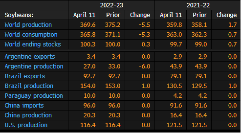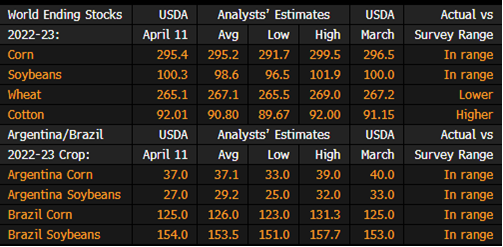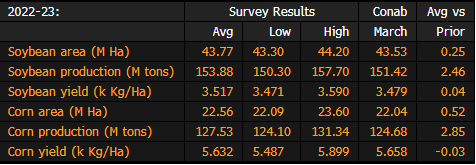 The following table shows results of a Bloomberg News survey of as many as eight analysts for Brazil’s soybean and corn crops. Conab, the Brazilian national supply company, is scheduled to release its latest estimates on April 13 at 9am local time.