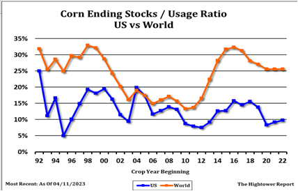 - In 2022-23, corn production estimate was slightly cut to 125m tons from 125.5m tons previously due to planting delays, which raises the risk of losses on adverse weather