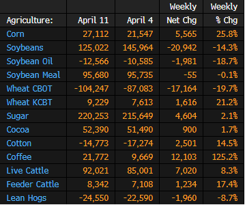 Preliminary changes in futures Open Interest as of April 14 were: SRW Wheat up 7,336 contracts, HRW Wheat up 5,498, Corn up 11,679, Soybeans down 1,997, Soymeal up 6,036, Soyoil up 2,620.