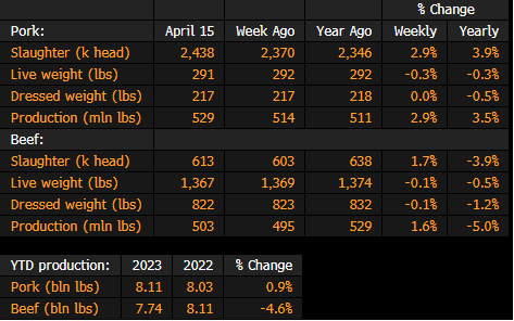 US federally inspected pork production rises to 529m pounds for the week ending April 15 from 514m in the previous week, according to USDA estimates published on the agency’s website.