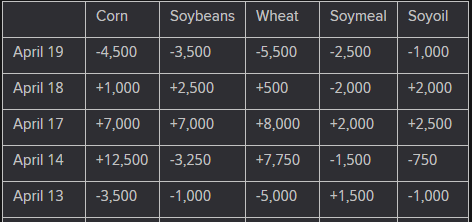 The player sheet for 4/19 had funds: net sellers of 5,500 contracts of SRW wheat, sellers of 4,500 corn, sellers of 3,500 soybeans, sellers of 2,500 soymeal, and sellers of 1,000 soyoil.