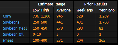 Estimate ranges are based on a Bloomberg survey of four analysts; the USDA is scheduled to release its export sales report on Thursday for week ending April 13.