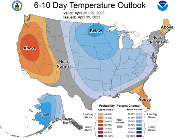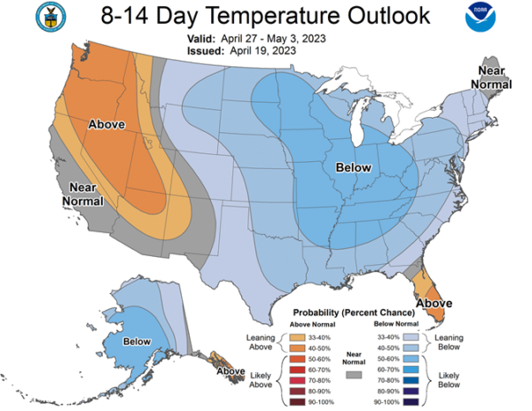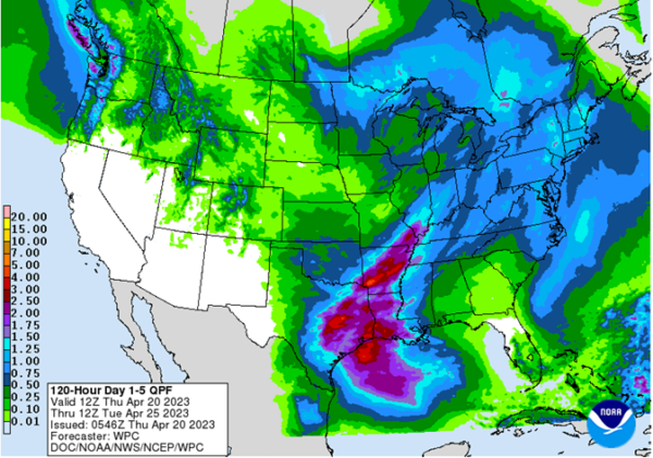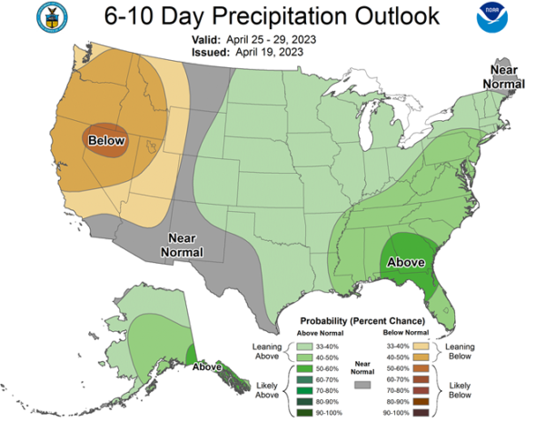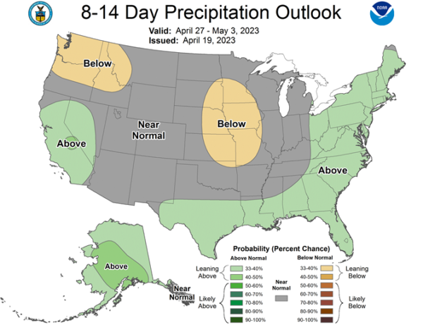 Delta Forecast: Another system is likely to produce widespread precipitation Thursday and Friday in the Delta and more is expected next week. Many areas of the region are wet, limiting spring planting. Some areas that have been able to plant will find good conditions for germination and early growth, though temperatures will be on the cooler end of normal.