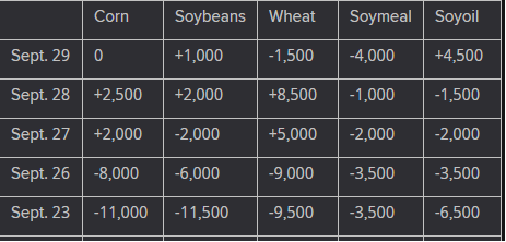 The player sheet for Sept. 29 had funds: net sellers of 1,500 contracts of SRW wheat, sellers of 0 corn, sellers of 1,000 soybeans, sellers of 4,000 soymeal, and buyers of 4,500 soyoil.