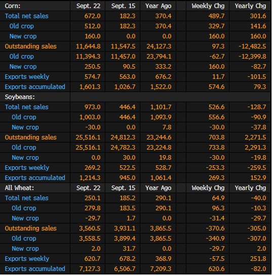 US Agriculture Export Sales for Week Ending Sept. 22 (Table)