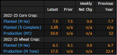 - 2022-23 corn area held at 7.5m ha, planting 6% complete