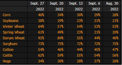 - 46% of the wheat crop is in a poor-to-very poor condition vs. 42% last week