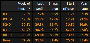 The following table shows the percent of US agricultural production within an area that experienced drought for the week ending Sept. 27, according to the USDA’s weekly drought report.