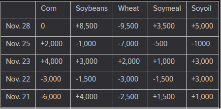 The player sheet for Nov. 28 had funds: net sellers of 9,500 contracts of SRW wheat, sellers of 8,500 soybeans, buyers of 3,500 soymeal, and buyers of 5,000 soyoil.