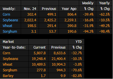 - Corn: 302k tons vs 499k the previous wk, 806k a yr ago