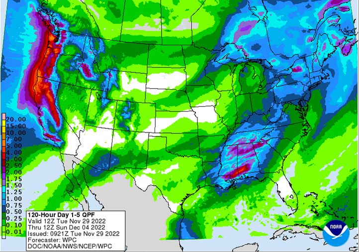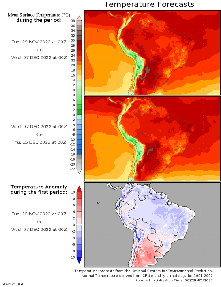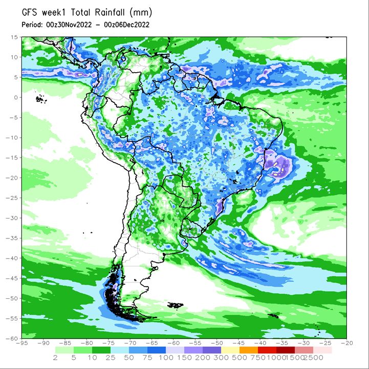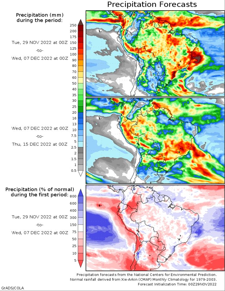 Brazil Grains & Oilseeds Forecast: Rio Grande do Sul and Parana Forecast: Isolated showers north Tuesday. Scattered showers Wednesday-Friday. Temperatures near to above normal through Friday. Mato Grosso, MGDS and southern Goias Forecast: Scattered showers through Friday. Temperatures near normal through Friday.