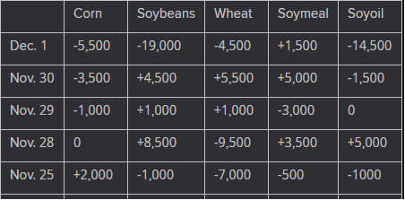 The player sheet for Dec. 1 had funds: net sellers of 4,500 contracts of SRW wheat, sellers of 5,500 corn, sellers of 19,000 soybeans, buyers of 1,500 soymeal, and sellers of 14,500 soyoil.