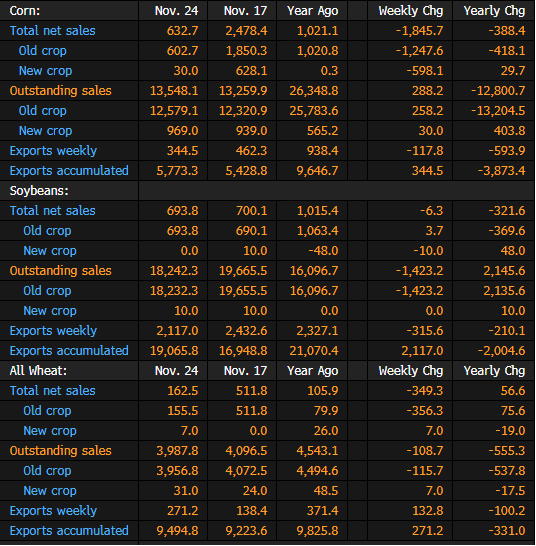 - Corn export premiums for late December loadings were unchanged at around 143 cents over December futures.