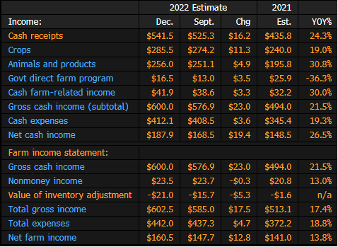 The USDA expects farmer profits to be $160.5b in 2022, higher than its previous est. of $147.7b in September, according to the agency’s Farm Income and Financial Forecasts report, released on Thursday.