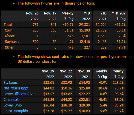 Barge shipments down the Mississippi river declined to 751k tons in the week ending Nov. 26 from 841k tons the previous week, according to the USDA’s weekly grain transportation report.