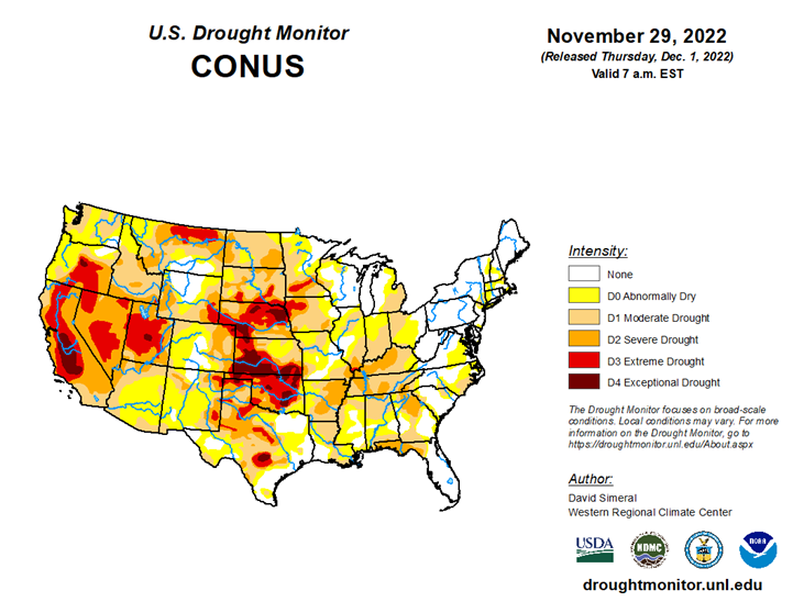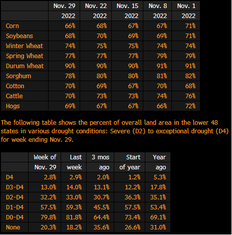 The following table shows the percent of US agricultural production within an area that experienced drought for the week ending Nov. 29, according to the USDA’s weekly drought report.