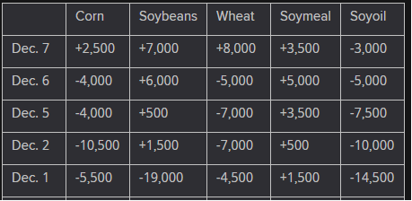 The player sheet for Dec. 7 had funds: net buyers of 8,000 contracts of SRW wheat, buyers of 2,500 corn, buyers of 7,000 soybeans, buyers of 3,500 soymeal, and sellers of 3,000 soyoil.