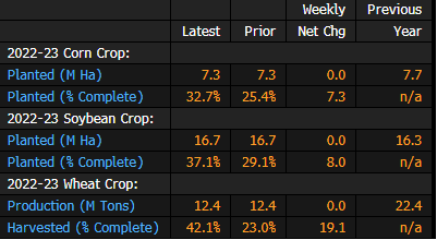 - 2022-23 soybean and corn area estimates both are unchanged from the previous week
