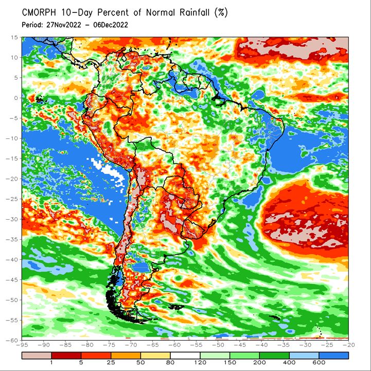 As of 03 December, Brazil’s first corn is 71.2% planted nationally according to the latest CONAB crop progress report (05 December), still behind last year’s pace of 77.9%, but the gap has been greatly reduced reflecting recent sowing efforts. The Refinitiv Weather Research team’s recently released ENSO report for December-February indicates a mostly favorable temperature and precipitation outlook for Brazil’s major crop growing regions. Barring any unexpected extreme weather events, corn production should be well on track for a record-breaking season.