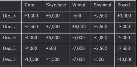 The player sheet for Dec. 8 had funds: net sellers of 500 contracts of SRW wheat, buyers of 1,000 corn, sellers of 6,000 soybeans, buyers of 2,500 soymeal, and buyers of 1,000 soyoil.