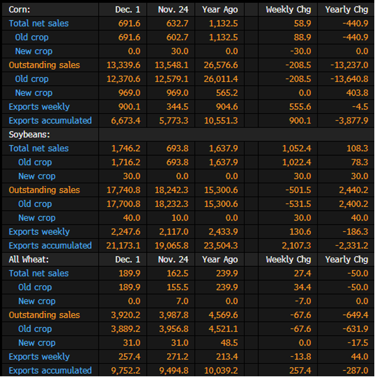 The following table shows US export sales of soybeans, corn and wheat by biggest net buyers for week ending Dec. 1, according to data on the USDA’s website.