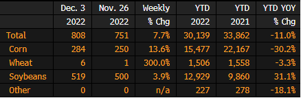 - Brazil 2021/22 soy sales were 92.6% as of Dec. 8, compared with 89.2% as of Nov. 4