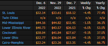 - St. Louis barge rates were $32.14 per short ton, a decline of $1.47 from the previous week