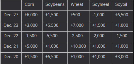 The player sheet for Dec. 27 had funds: net buyers of 500 contracts of SRW wheat, buyers of 6,000 corn, buyers of 1,500 soybeans, sellers of 1,000 soymeal, and buyers of 6,500 soyoil.