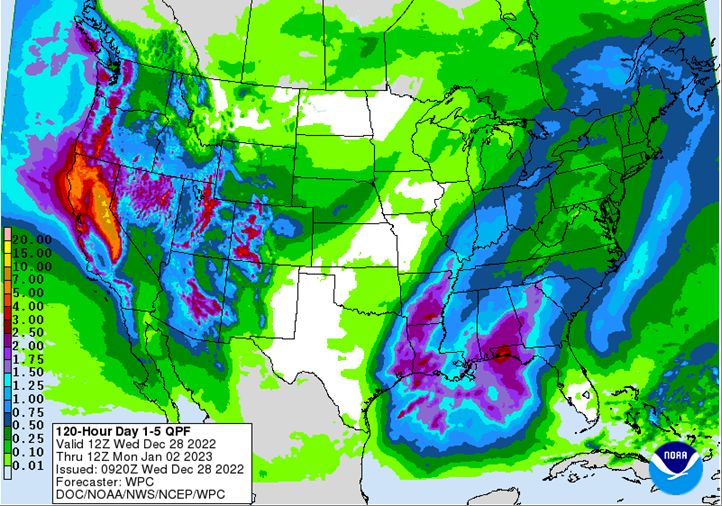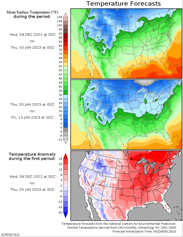 Midwest Forecast: In the Midwest, very cold temperatures from the polar vortex are shifting eastward this week, being replaced by some very warm air. Snowfall that came for Christmas will be melting quite a bit. In addition, scattered rain showers are expected later this week and weekend with a couple of disturbances moving through, mostly along the Ohio Valley.