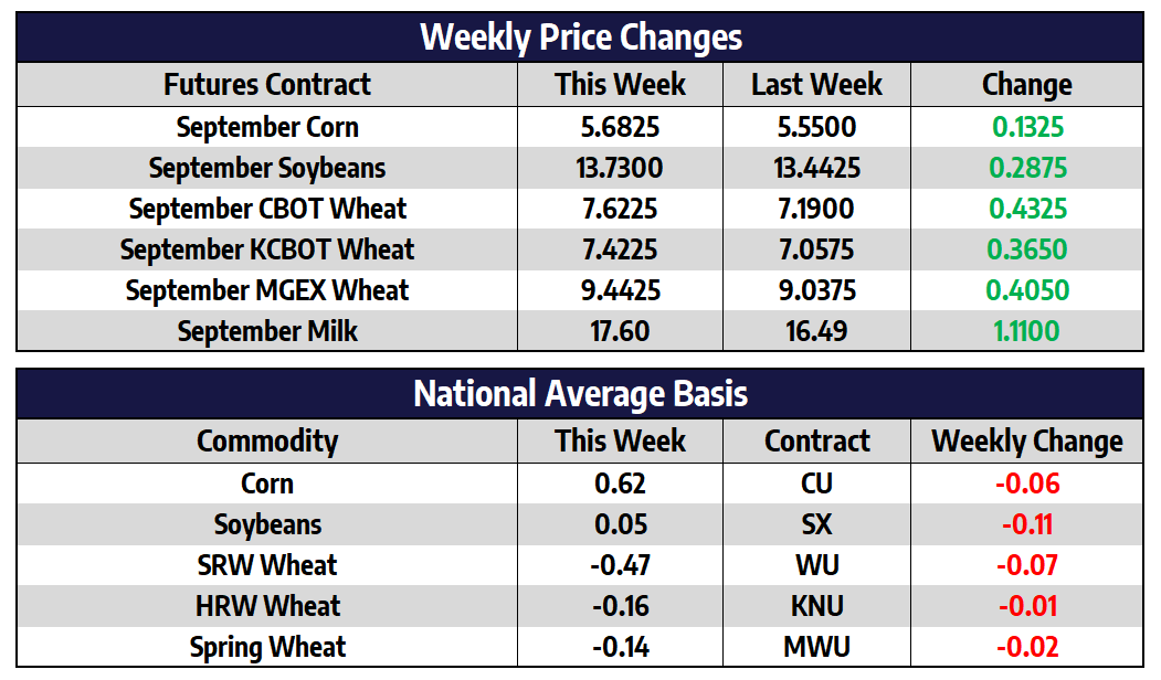 September CBOT wheat futures added 43-1/4 cents this week to close at 762-1/4. September KC wheat futures added 36-1/2 cents this week to close at 742-1/4. September spring wheat futures added 28 cents this week to close at 944-1/4. US wheat production came in at a 19-year low on yesterday’s report. Reductions to Russia and Canada wheat crops also helped to support the wheat market this week. US 2021/22 all wheat production came in at 1.697 billion bushels, down from 1.746 billion in July. World wheat ending stocks came in at 279.06 million tons down from 291.68 million in July. September CBOT and KC wheat futures closed into new contract highs this week following the release of Thursday’s numbers.
