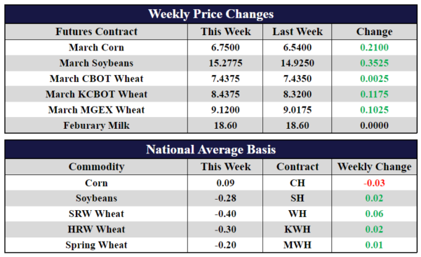 - March CBOT soybean futures gained 35-1/4 cents this week to close at 1527-3/4.