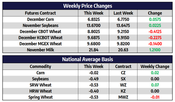 - After trading above $7 on Monday for the first time since June front month corn closed the week back in its recent sideways range.