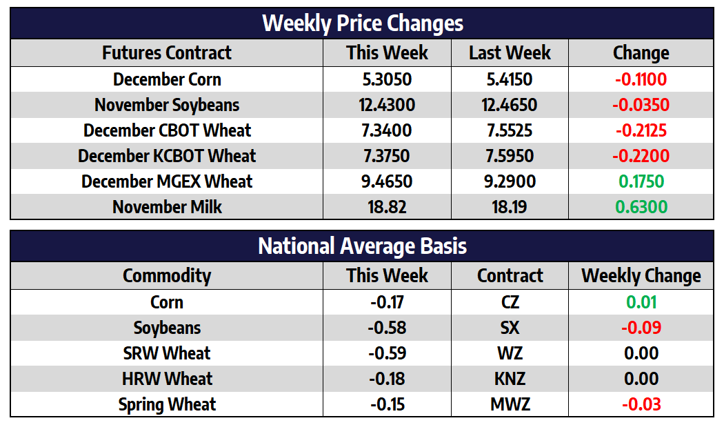 November soybean futures shed 3-1/2 cents this week to close at 1243. July of 2022 futures were a penny lower this week to close at 1277-1/2. Soybean futures found strength early in the day on Friday on rumors of Chinese interest in US soybeans. Export sales for soybean after starting the marketing year slightly ahead of the pace needed to meet the USDA’s 2021/22 projection are currently running 87 million bushels behind the needed pace. The market will look for confirmation of this rumor to start next week as well as focus on Tuesday’s USDA supply and demand report.