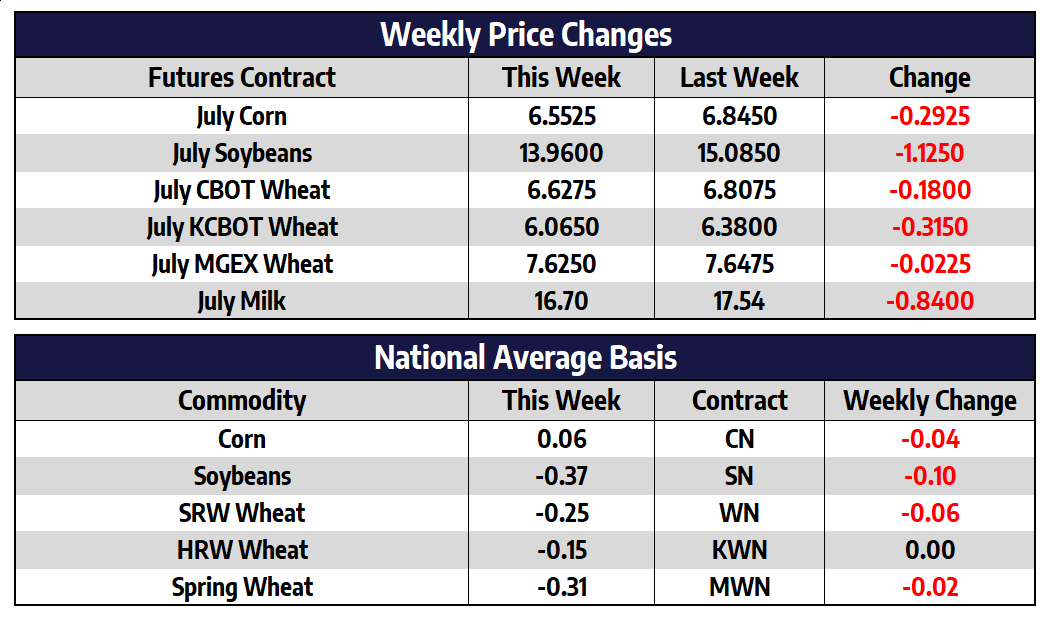 July corn futures shed 29-1/4 cents this week to close at 655-1/4. New crop December futures shed 43-1/2 cents this week to close at 566-1/4. December corn futures rallied 33 cents on Friday after falling the daily 40-cent limit on Thursday. Limits were expanded for Friday’s trade but will be back to the usual 40 cent limit for Monday. New crop prices were lower on the week and closed right at the 10-week moving average, a pivotal indicator in bigger bull markets. New crop prices have stayed above the 10-week average since November of 2020. Weather will continue to dominate headlines in the corn market over the next week and a half before the June 30th planted acreage and grain stocks report. This report is historically the most volatile report of the year for the corn market.