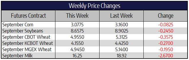 Chicago September wheat futures were 35-3/4 cents lower this week to close at 495-1/2. September KC wheat futures were 27 cents lower this week to close at 415-1/2. September MPLS spring wheat futures were down 19-1/2 cents this week to close at 494-1/2 their lowest front month close since November of last year. France’s farm ministry lowered its estimate of the 2020 soft wheat harvest to 29.71 million tons, down 1.6 million tons from its initial forecast last month and now 25% below last year’s crop, due to the continued effects of adverse weather. The reduced forecast was 16% lower than the average of the past five years and included the smallest harvested area since 1994, the ministry said in a crop report on Wednesday. Talks of bigger than expected crops in both Russia and Canada plus improving spring wheat conditions contributed to selling pressure this week.