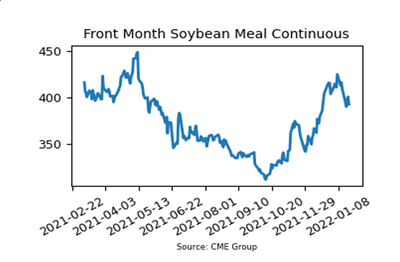 March soybean meal futures finished the week $12.90 per ton lower to $392.70 this week. The contract hit a high of $405.30 and a low of $389.40 for the week. Support for the bean complex on Friday came from the fact that China purchased 132,000 metric tons of soybeans from the US for delivery during the 2021/2022 marketing year. Argentina continues to get rain but parts of Paraguay and southern Brazil remain hot and dry. The Buenos Aires Grain Exchange lowered Argentina’s soybean crop condition to 30% good to excellent. This was down 1% from last week. One private estimate yesterday put the Brazilian soybean crop as low as 127 mmt. Palm oil prices are making new highs, adding some support to beans.