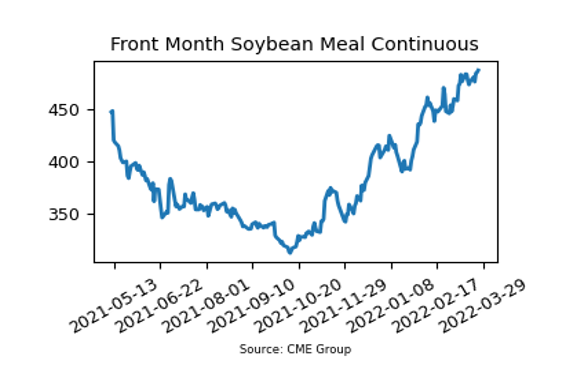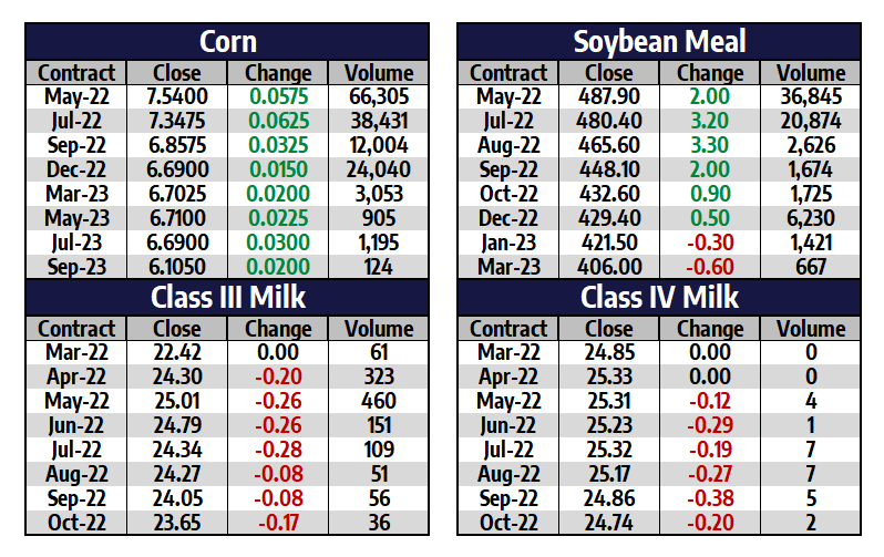 To give you an idea how flat corn prices have been in recent weeks, May corn futures have traded at $7.50 at least once during each of the last 17 trading days. This week, the contract closed 12.25 cents higher at $7.54 and unless something happens in the meantime with Russia/Ukraine or in South America, the markets will likely continue to hang in a tight range until next Thursday’s Planting Intentions Report. That report is often a mover but it is tough to think of a time where this was this much outside market pressure affecting the markets, which could mute the reaction a bit. There still is so much to become known when it comes to Ukraine between exports and upcoming planting, and there also is no way to know what is “priced in” already, so the markets will stay volatile. The International Grains Council lowered their expectation for Ukrainian corn exports from 31.9 million metric tons to 21.0 mmt. On the bearish side, there are widening reports of avian flu spreading, with nearly 7 million birds culled nationwide since the outbreak in February, and Brazil’s corn crop is off to a great start.