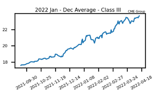 US cheese continues to be the main driver of higher milk prices so far this week with buyers getting aggressive again on Thursday. Buyers pushed up blocks another 4.25c to $2.3725/lb on 5 loads traded. The barrel market added 6c to $2.44/lb on a whopping 10 loads traded. Demand is still very strong for US cheese. The bidding in cheese took class III milk futures higher and the May 2022 contract retested the all-time high class III price of $25.55 intraday. May finished the session up 29c to $25.46 on 366 contracts traded. Most class III contracts closed up double digits and there was some heavy bidding out into the 2023 strip. April 2023 added 35c, May added 43c, and June added 20c. The market continues to keep hefty premium out in those contracts.