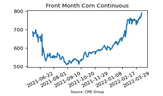 The front month May corn futures contract closed higher in three out of the four sessions this week, adding a total of 21.50c and closing up at $7.9050/bu. The market continues to receive support in both old crop and new crop contracts as expected planted corn acres will be their lowest since 2018. Even the December 2022 corn contract has seen a lot of premium added to the contract in recent weeks. The contract is up four weeks in a row, adding 89.75c over that stretch. December corn closed Thursday at $7.3525 per bushel. Planting progress will be watched closely in the coming weeks as the US is currently behind the 5-year planting pace. Although it still is very early in the planting season. Rains in the eastern corn belt over the coming days are expected to delay plantings. The Buenos Aires Grain Exchange rated 20% of Argentina’s corn crop good to excellent, which was down 1% from last week. The grain markets will be closed tomorrow in observance of the Good Friday holiday.