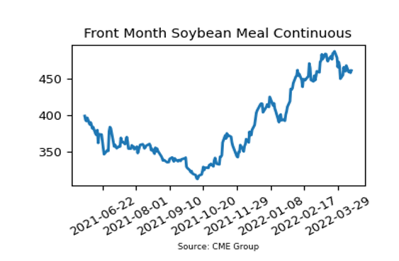 The soybean meal futures market has gone three weeks now without putting in a new high for the move. Market conditions have changed after the USDA said that there would be a record number of soybean acres planted in the US this year. For now, the market is consolidating just above the $450/ton level. Export demand should help keep levels somewhat elevated despite an expected large crop size this year. It was reported on Thursday that China bought 132,000 mt of soybeans from the US for delivery during the 21/22 marketing year. There is also a possibility for increased US exports as Brazil will be out of the marketplace. Front month soybean meal currently sits at $461.40 per ton while the December contract is down at $418.90 per ton.