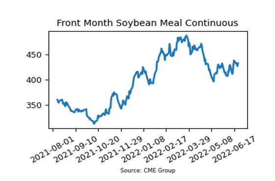 – August soybean meal futures were down $11.10 per ton this week and posted a close at $411.40