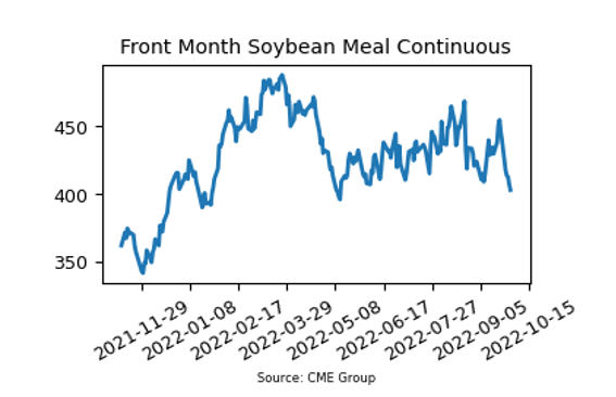 - Front month soybean meal futures finished the day at $403.00/ton today, the lowest close since May 12th
