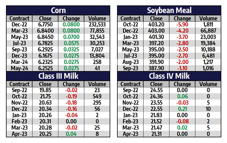 The October Class III contract came under selling pressure at the $22.00 mark once more, closing down 19 cents on the day but still up 85 cents on the week. The Class IV trade was mixed today but the October contract was up 6 cents on the day/week to close at $24.36, 81 cents above the November contract as the calendar shifts to a new month and quarter on Monday. The spot trade was quiet today on low volume and movement. Next week will give the market a Dairy Products Production report on Tuesday as well as a Global Dairy Trade Auction, followed by August Dairy Exports on Wednesday.