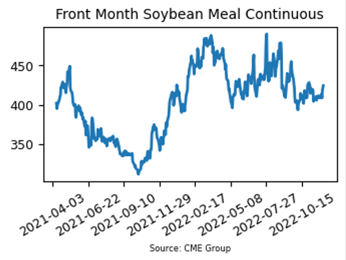 - January soybean meal futures closed $17.80/ton higher at $424.10 this week